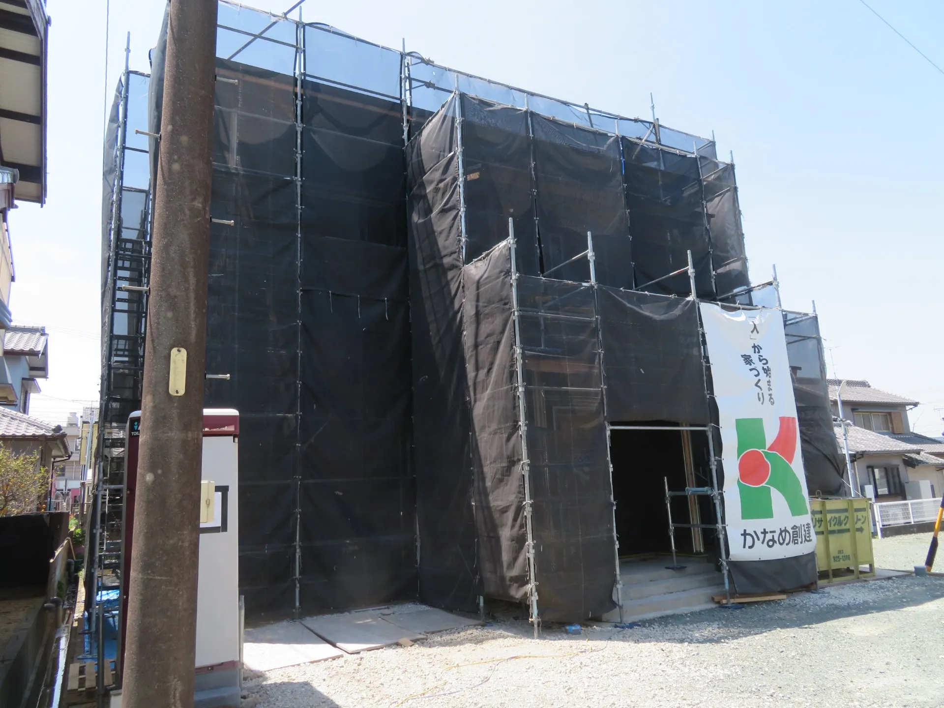 3月に上棟したお家なんですが、外壁工事が始まりました。